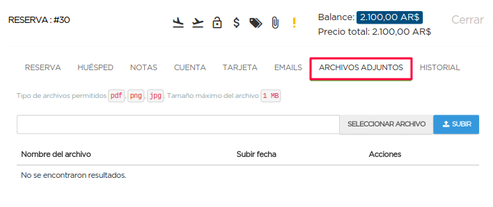 7.- ARCHIVOS ADJUNTOS: En esta sección podrás seleccionar algún archivo PDF, PNG o JPG desde tu computadora y asociarlo con la reserva.