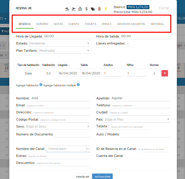 2.- HUÉSPED: En esta sección puedes visualizar los huéspedes que estarán ocupando la habitación para las fechas especificadas. Además, puedes agregar los que sean necesarios.