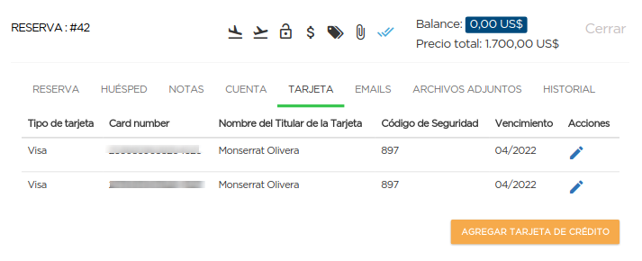 A continuación se mostrará el historial de tarjetas de crédito que el huésped ingresó hasta el momento.