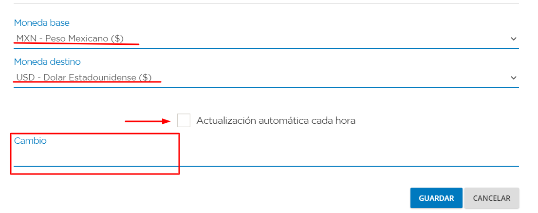 A) Manual: después de colocar la moneda base y la moneda destino debes agregar el "Cambio" (recuadro rojo) es decir el monto en tú moneda que equivale a 1 unidad de Dolar. Si deseas actualizarlo posteriormente, debes hacerlo manualmente.