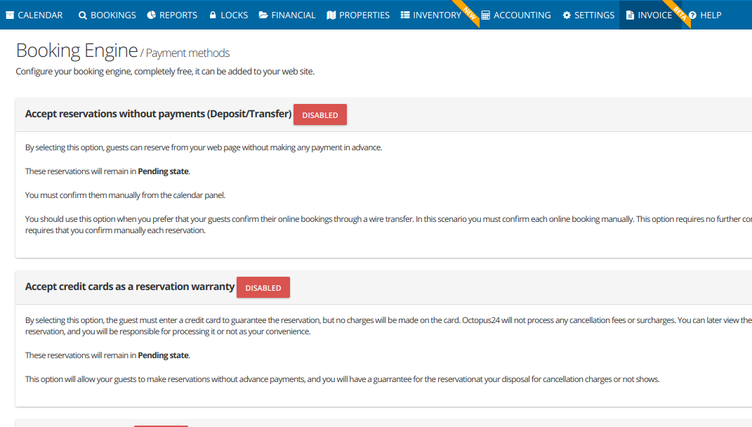 3.- Configuration> Booking Engine> Payment methods https://app.octopus24.com/settings/booking-engine/payments