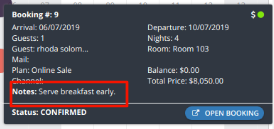 When you click on the reservation and the Tooltip opens (black box with information containing the reservation data) you will see a sign of your staff notes as shown in the following image:
