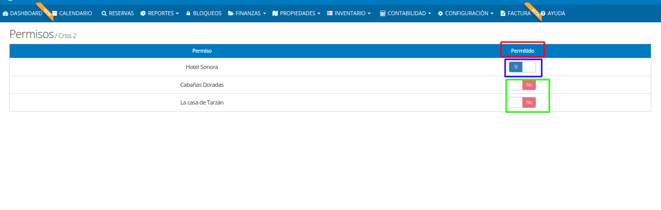 Posteriormente en la opción de "Permitido" (cuadro rojo), Habilita "SI" (cuadro morado) para que el usuario pueda ver la propiedad marcada. Deja el botón en "NO" (cuadro verde) en las propiedades que el usuario no debe tener acceso.